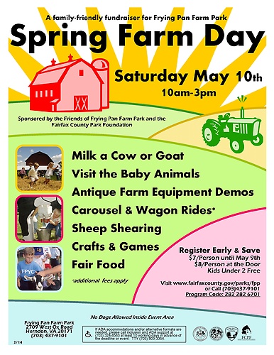 Join us at Frying Pan Farm Park for Spring Farm Day Saturday May 10th.  This family-friendly fundraiser features cow milking, baby animals, antique farm equipment demos, sheep shearing, crafts & games, and fair food.  Register online with a member number or call (703) 437-9101 www.fairfaxcounty.gov/parks/fpp
